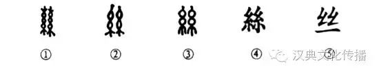 白居易有這樣的詩(shī)句:“潯陽(yáng)地僻無(wú)音樂(lè ),終歲不聞絲竹聲?!边@個(gè)“絲竹”的“絲”字就是個(gè)象形字。甲骨文①就是兩小把蠶絲扭在一起之形。金文②與甲骨文的形體相類(lèi)似。小篆③是從金文演變而來(lái)的。④是楷書(shū)的寫(xiě)法。⑤是簡(jiǎn)化字。