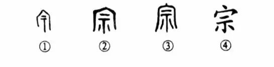 “萬(wàn)變不離其宗。”這個(gè)“宗”字本為會(huì )意字。①是甲骨文的形體,外部是房舍,其內有祭祖的靈石,表示這里就是宗廟。②是金文的形體,房舍之內是“示(靈石)”,仍為祭祖之義。③是小篆的形體。④為楷書(shū)的寫(xiě)法。