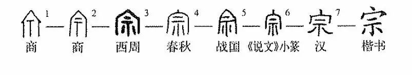 《說(shuō)文》:“宗,尊祖廟也。”如《詩(shī)經(jīng)·大雅·鳧鹥》:“既燕(宴)于宗。”這是說(shuō):已經(jīng)宴飲在祖廟。由此又可以引申為“祖宗”,如《左傳·成公三年》:“使嗣宗職。”大意是:使我繼承祖宗傳下來(lái)的職位。后又引申為“宗族”,如《史記·秦始皇本紀》:“車(chē)裂以徇,滅其宗。”“徇”是對眾宣示。也就是說(shuō):車(chē)裂其身以示眾,并滅掉了他的宗族。上古以宗為本,所以“宗”也能當“本”、“主旨”講,如《老子》:“言有宗。”這是說(shuō):言論要有所本。
