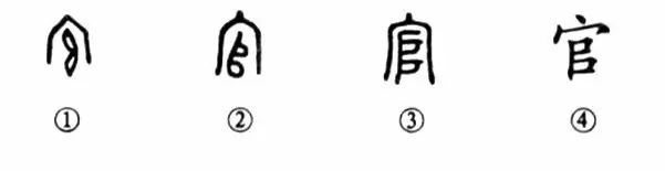 這個(gè)“官”字是個(gè)會(huì )意字。甲骨文①的外部是“山”,即上古的屋形,其內是“弓”?!肮迸c“王(斧)”類(lèi)似.在古代均為有鎮壓之權的標志??梢?jiàn)屋內掛“弓”,是表示權威之所在,也就是“官府”的意思。②是金文形體,與甲骨文很相似。③是小篆的形體,屋內之“弓”,已經(jīng)變得不像了。④是楷書(shū)的寫(xiě)法。