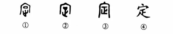 這是“一籌定乾坤”的“定”字。甲骨文①的外面是個(gè)房子,房?jì)壬蠟椤翱凇毕聻椤爸埂保_),其實(shí)就是個(gè)“正”字?!罢弊值谋玖x就是腳站得端正,不偏不斜。那么在室內不偏不斜即為“安定”或“定居”之義??梢?jiàn)“定”字也是個(gè)會(huì )意字。金文②的形體則同于甲骨文,只不過(guò)“正”上的“口”變成了實(shí)心的,其義未變。③是小篆的寫(xiě)法,室中就是個(gè)“正”字。④是楷書(shū)的寫(xiě)法?!板病毕碌摹罢弊肿兂闪恕??”了。形體有所改變,但其義仍未變。