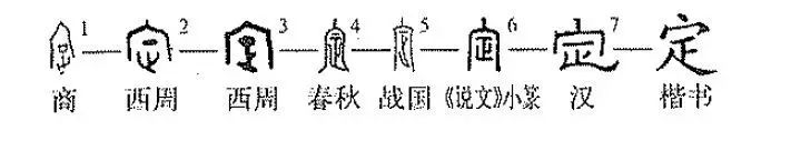 會(huì )意兼形聲字。從宀,從正,正亦聲。在商代甲骨文中,“定”的聲符“正”是由一個(gè)口形和一個(gè)人腳形組成的。在西周金文中,這個(gè)口形變?yōu)樘顚?shí)的長(cháng)方形或圓形。后來(lái)逐漸變?yōu)橐粰M。值得注意的是,古文字中的“