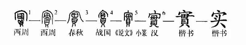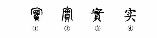 “傳聞之事,恒多失實(shí)?!边@個(gè)“實(shí)”字本為會(huì )意字。①是金文的形體,其上部為“宀”,即房屋之形,屋內有“貫(錢(qián)財)”。②是小篆的形體,與金文形體相似。③是楷書(shū)繁體字。④為簡(jiǎn)化字。