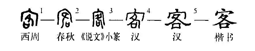 形聲字。從宀,各聲?!翱汀钡穆暦案鳌?,由“夂”(本像人腳形)和“口”組成?!扳骸北境?,到了秦代隸書(shū),開(kāi)始被橫過(guò)來(lái),這樣不便于書(shū)寫(xiě)。所以漢代隸書(shū)中角度向下扭轉,以便于書(shū)寫(xiě)。本義是賓客,客人。《廣韻·陌韻》“客,賓客。”《禮記·曲禮下》:“主人敬客,則先拜客,客敬主人,則先拜主人。”引申為顧客、門(mén)客、客卿等意義。(張玉金)