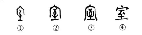 “室雅人和美?!边@個(gè)“室”字本為會(huì )意兼形聲的字。甲骨文①的上部為房屋之其內為“至”,既為讀音,也表示“止息”之義。②是金文的形體,與甲骨文甚似。③是小篆的形體。④為楷書(shū)的寫(xiě)法。