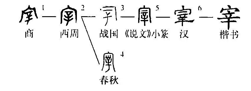 這個(gè)“宰”字。也是會(huì )意字。甲骨文①在“宀”(屋)內有“辛”,“辛”字本為平頭刀之形.也就是說(shuō)在屋內以刀操勞即為“宰”,所以“宰”本為奴隸。②是金文的形體,沒(méi)有什么變化。③是小篆的形體,筆畫(huà)較甲、金文多了幾筆??瑫?shū)④是直接由小篆演變而來(lái)。