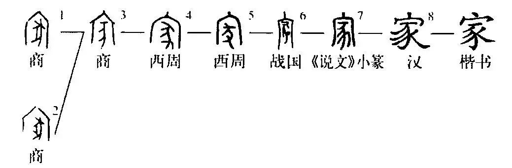 會(huì )意兼形聲字。《說(shuō)文》:“家,居也。從宀,豭省聲。”又說(shuō):“豭,牡豕也?!贝苏f(shuō)有據。在商代甲骨文中,“家”有兩種寫(xiě)法,一種是“宀”(房屋的象形)中的豕為雄性的(腹部有突出的雄性生殖器),另一種較簡(jiǎn)單的寫(xiě)法,不強調性別。突出雄性生殖器的“豕”應是“豭”的象形初文,是兼稱(chēng)聲符的。而不強調性別的“豕”則是省形。到了周代金文中以不強調性別的寫(xiě)法為主,后世的“家”字就是由這種寫(xiě)法演變而成。在商代甲骨文中,“家”中的“豕”大多是畫(huà)出豬體的輪廓,也有只畫(huà)出豬體的線(xiàn)條的,周代金文的“家”是由這種簡(jiǎn)便的寫(xiě)法演變而成。在甲骨文中出現了省略像豕的前蹄的筆畫(huà)的寫(xiě)法,但周代金文則是由甲骨文的完整寫(xiě)法演變而成。另外,在周代金文中“豕”的原像豬的后蹄和豬尾的筆畫(huà)是連成一筆的,一直到西漢隸書(shū)中才分成兩筆,到了東漢隸書(shū)中又分成三筆,書(shū)寫(xiě)更便利了。(張玉金)