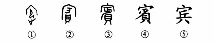 這是“賓至如歸”的“賓”字,本為會(huì )意字。甲骨文①的外部是房屋之形,中間跪著(zhù)一個(gè)人,人下有“止(腳)”,表示走進(jìn)祀神之意。②是金文的形體,其下部又增加了“貝”。③是小篆的形體,發(fā)生了較大的訛變。④為楷書(shū)繁體字的形體。⑤為簡(jiǎn)化字。