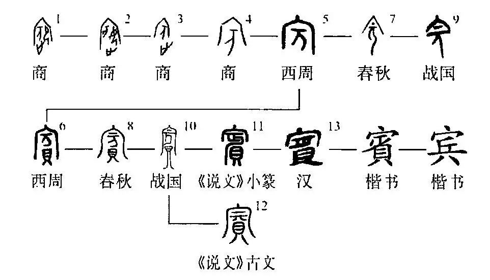 ”(隸定作??),為后世文字所本。西周時(shí),“賓”引申出贈送、贈品等義。為了表示這類(lèi)意思,又在“??”字上加注“貝”旁(字形6),成為從貝、??聲的形聲字。春秋戰國時(shí),“??”所從的“萬(wàn)”上多有一飾筆(《說(shuō)文》古文“賓”字作