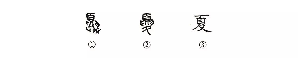 這個(gè)“夏”字的上古形體較為復雜。從金文①看,其上為“頭”,中間為“軀干”,兩側為“手”,其下為“足”,實(shí)際上就是“人”形。②為小篆的形體,也是“人”形,但已經(jīng)發(fā)生了偽變,人的身軀部分沒(méi)有了,只是一只大腳還在。③是楷書(shū)的形體,它是從小篆演變而來(lái),根本看不出人的形象了。