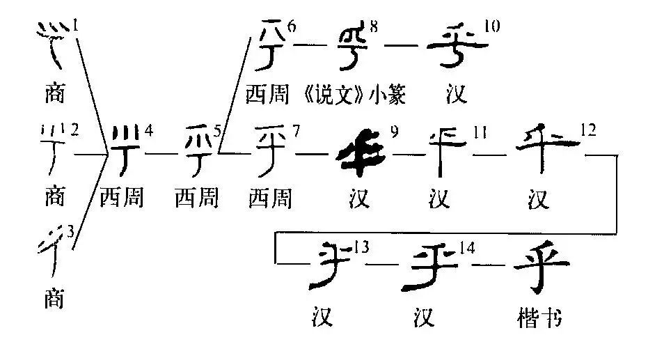 ”只是像聲氣分散上揚之形,并不是獨立的字形?!昂酢迸c“兮”形音義都有關(guān)聯(lián),二者是一字之分化,所以《說(shuō)文》曰:“(乎)從兮,象聲上越揚之形也。”殷商時(shí)代的“乎”字上部是三個(gè)短畫(huà),以豎畫(huà)為主,也有斜畫(huà)。至西周中期,短豎平行之態(tài)幾乎消盡,而變作不平行的“