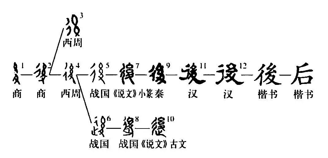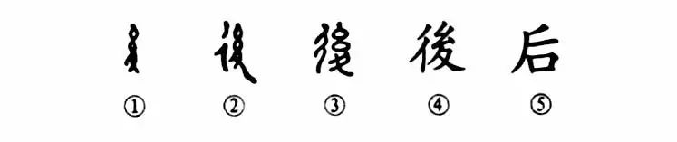 “如積薪耳,后來(lái)者居上?!跋群蟆敝昂蟆钡谋咀譃椤搬帷?,原為會(huì )意字。甲骨文①的上部為繩索之形,下部是一只腳趾朝下的腳(止)。林義光說(shuō):“足有所系,故后不得前。”②是金文的形體,其左又增加一個(gè)表示行走的“彳”,由原來(lái)的會(huì )意字變成了形聲字。③是小篆的形體,與金文基本相同。④為楷書(shū)的繁體字。⑤為被借用的簡(jiǎn)化字。