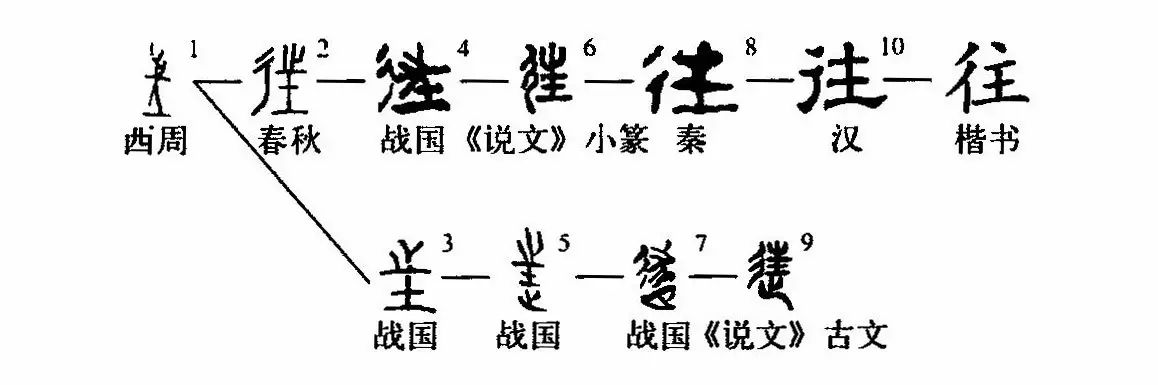 ,從止,王聲,為往之初文。春秋時(shí)期始加彳旁以強調行的意義。往在戰國時(shí)期字形比較多樣,或承襲甲骨文加以變形,作