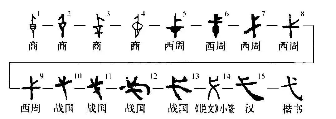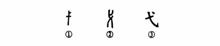 “弋”字讀作yì,是個(gè)象形字。①是周朝晚期金文的形體,像一根帶杈的小木樁之形。②是小篆的形體。③是楷書(shū)的寫(xiě)法,看不出木樁的樣子了。