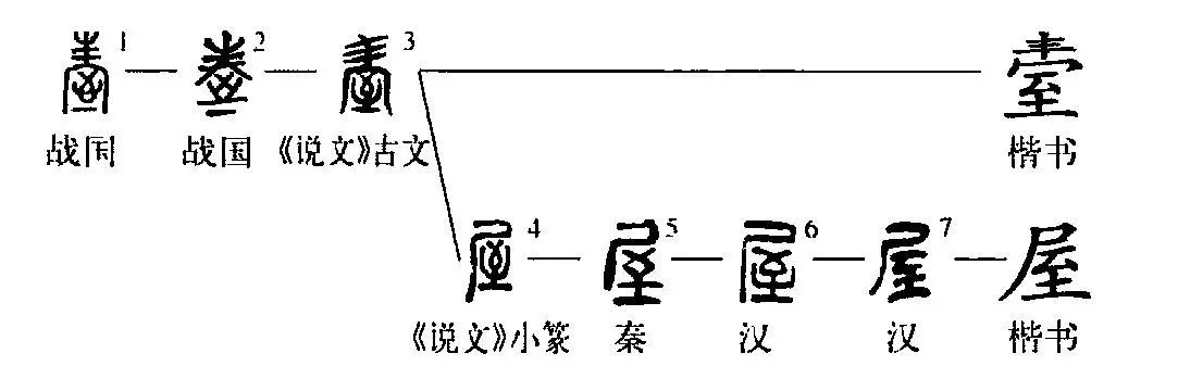 ,古文屋。”段玉栽注:“屋者,室之覆也。引申之,凡覆于上者皆曰屋。天子車(chē)有黃屋,《詩(shī)》箋:‘屋,小帳也?!?/strong>”《詩(shī)?小雅?十月之交》:“徹我墻屋。”《小雅?正月》:“瞻烏爰止,于誰(shuí)之屋?”《召南?行露》:“誰(shuí)謂雀無(wú)角(鳥(niǎo)嘴),何以穿我屋?”《谷梁傳?文公十三年》:“大室屋壞。”范寧注:“屋者,主于覆蓋,明廟不都壞。”《淮南子?主術(shù)》:“是故十圍之木,持千鈞之屋。”由上引文獻可知,屋字之本義是屋蓋、屋頂,引申為房屋之屋。《詩(shī)?秦風(fēng)?小戎》:“在其板屋,亂我心曲。”《易?豐》:“上六,豐其屋。”上引文獻則用為房屋之義。屋字未見(jiàn)于甲骨文、西周金文,最早形體見(jiàn)于秦代文字,已是篆隸之間的形體,說(shuō)明此形體屋字至遲在春秋戰國時(shí)代已經(jīng)產(chǎn)生?!墩f(shuō)文》古文形體