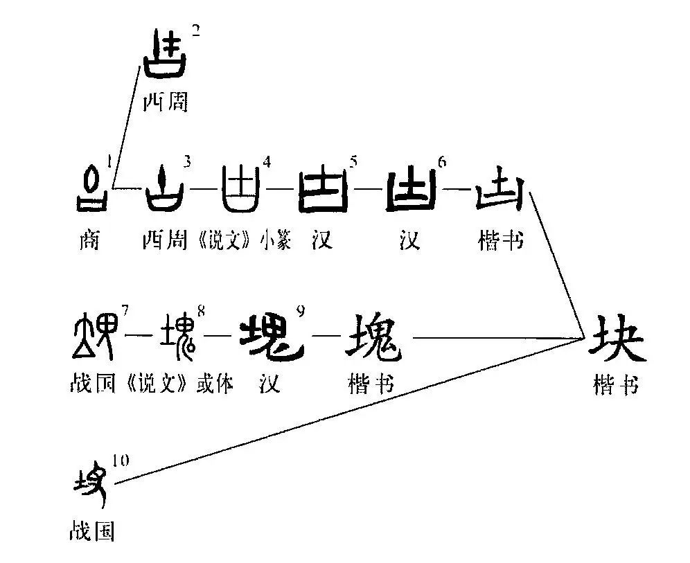 ”(讀若“介”)。此一系字形從《說(shuō)文》小篆正體后變化不大,最后寫(xiě)成“凷”。字形7、8、9為其異體,是形聲字。戰國時(shí)期寫(xiě)作從立,鬼聲?!墩f(shuō)文》小篆或體改從土,鬼聲。鬼字寫(xiě)法各個(gè)時(shí)期略有差異:有的有短撇,有的沒(méi)有;有的把“厶”寫(xiě)成點(diǎn),有的無(wú)“厶”亦無(wú)點(diǎn)。戰國文字還有一形作從土,夬聲,用作“缺”,如字形10,但其字形當是現代規范字“塊”的源頭?!皠S”的本義是土塊。《說(shuō)文》“凷,墣也。”《禮記?喪大記》:“父母之喪,居倚廬,不涂,寢苫 枕凷。”土塊可象征土地。擁有土地便擁有權力。由土塊引申作量詞用,指塊狀物或片狀物的數量。也用于銀幣或紙幣,等于“圓”?!皦K”在古書(shū)中還指孤獨或無(wú)動(dòng)于衷的樣子。(林志強)
