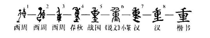 會(huì )意字。初文(如字形1)像一人身后背負盛得滿(mǎn)滿(mǎn)的囊橐,用以表示沉重義。后將形體進(jìn)行并劃性簡(jiǎn)化,即將人形豎畫(huà)和囊橐的象形文中的豎畫(huà)公用,使人形和囊橐形并和為一體,成為字形3那樣的形體。春秋以降,下面又增加了土旁。漢隸平直筆畫(huà),人形和囊橐形全失。《說(shuō)文》:“重,厚也。”段玉裁注:“厚斯重矣。引申之為鄭重、 重疊。”表厚重、沉重義,讀zhòng。引申之則為重大、重要、重視、重量、重任、重托等。重疊義,讀chóng。引申之則有重復、重逢、重合、重霄、重圍等。(董蓮池)