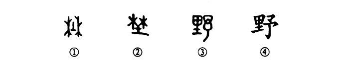 這是“野火燒不盡”的“野”字。甲骨文①的兩側是“木”(樹(shù)),中間是“土”,這就表明野外之土有山林??梢?jiàn)這個(gè)“野”字本為會(huì )意字。金文②也是這種形體,只不過(guò)“土”上有“林”,意思更確切??墒堑搅诵∽蹌t變得復雜了,其左是上“田”下“土”,這都表明野外有田有土;右邊是個(gè)“予”字,這是表聲音的(古代“野”與“予”的聲母相同,讀音相近),這就組成了左形右聲的形聲字了。④是楷書(shū)的寫(xiě)法,是直接由小篆的形體演變而來(lái)的。