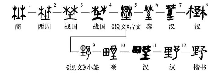 ”則分析為“從里省”,與此字源流演變的順序不符,非是?!耙啊钡谋玖x是郊外。《說(shuō)文》:“野,郊外也。”《書(shū)?武成》:“歸馬于華山之陽(yáng),放牛于桃林之野。”引申為曠野、田野、偏僻之地、邊境等,再引申為質(zhì)樸、粗鄙、蠻橫、不受拘束等,還引申為民間(與“朝”相對)、非正式的等。通“宇”,屋宇。《墨子?非樂(lè )上》:“非以高臺、厚榭、邃野之居,以為不安也。”清王念孫《讀書(shū)雜志》引王引之云:“野,即宇字也。古讀野如宇,故與宇通。”(林志強)