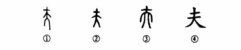 “使君自有婦,羅敷自有夫。”這個(gè)“夫”字是個(gè)象形字。甲骨文①的下部是“大”(就是正立著(zhù)一個(gè)人),“大”的上部有一小橫,表示頭簪形。這就是說(shuō):“以簪束發(fā)”,人已長(cháng)成。②是金文的形體,與甲骨文類(lèi)似。③是小篆的形體,其下部變得不像“人”形了。④是楷書(shū)的寫(xiě)法。