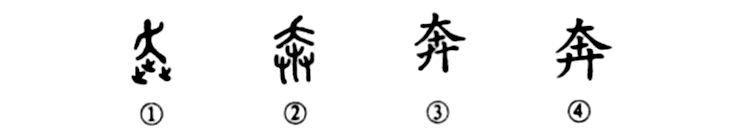 這是“星夜奔冀州”的“奔”字。這個(gè)字是個(gè)會(huì )意字。金文①的上部是一個(gè)“人”,下部是三個(gè)“止”(腳),表示一個(gè)人甩開(kāi)兩臂,邁開(kāi)“三只腳”,當然跑得更快了。②是小篆的形體,上部的人形還在,只是下部的“止”發(fā)生了偽變,變成了三棵草形,好像一個(gè)人在草地上奔跑似的。③是楷書(shū)的形體,小篆的三棵草又變成了三個(gè)“十”字,除了書(shū)寫(xiě)方便以外,“十”字是毫無(wú)意義的。④是簡(jiǎn)化字。