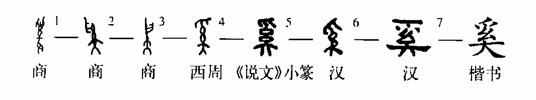 這個(gè)“奚”字是個(gè)會(huì )意字。甲骨文①的左上方是一只手(爪),手的右側是一條繩索形,繩索之下吊了一個(gè)人。這就表示捉來(lái)了一個(gè)奴隸。金文②的形體也基本上同于甲骨文,只是“手”移到了右上方。③是小篆的寫(xiě)法,不太像捉住一個(gè)人的樣子了。④是楷書(shū)的寫(xiě)法,原來(lái)的“人”形變成了“大”字。
