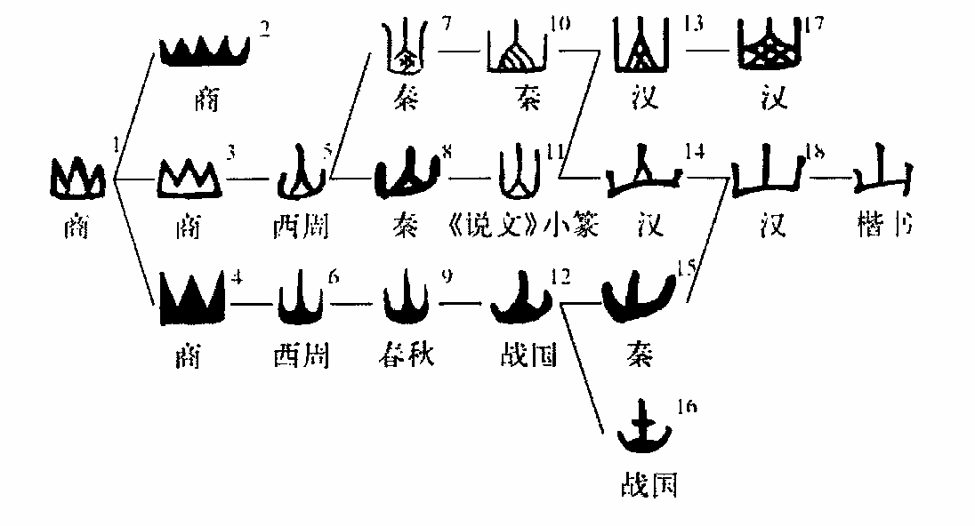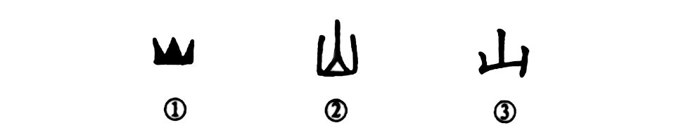 “黃河遠上白云間,一片孤城萬(wàn)仞山?!边@里的“山”字就是個(gè)象形字。金文①是三個(gè)山峰組成一個(gè)“山”字。小篆②為了書(shū)寫(xiě)方便則將實(shí)心山變?yōu)閱尉€(xiàn)的了,但三個(gè)山峰還仍然保存。③是楷書(shū)形體,基本上與小篆相同。