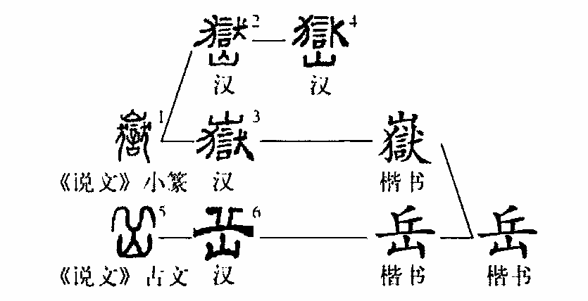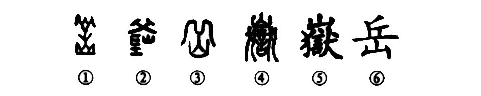 “輕氣暖長(cháng)岳,雄虹赫遠峰?!边@個(gè)“岳”字的形體原很復雜。①是甲骨文的形體,像上下多層山岳的形狀,可見(jiàn)這是個(gè)象形字。②是古璽文的形體,由三部分組成,其上部像山峰起伏,其下左為“阜”,阜下為“土”,右為“山”,表示山岳之意。③是《說(shuō)文》中古文的寫(xiě)法,比古璽文簡(jiǎn)化了許多,上為遠丘形,下有山。④是小篆的寫(xiě)法,變成了“從山,從獄得聲”的形聲字了。⑤為楷書(shū)繁體字的寫(xiě)法。⑥為簡(jiǎn)化字。