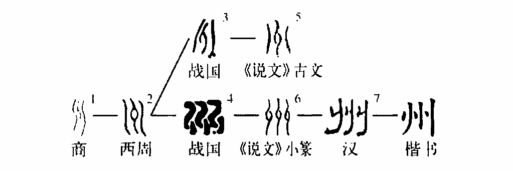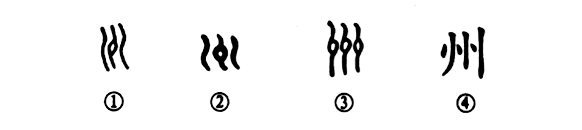 “關(guān)關(guān)雎鳩,在河之州?!边@個(gè)“州”字是個(gè)象形字。你看甲骨文①的形體就很清楚,自上而下的三條曲線(xiàn)就是“川”字,表示河流,而中間有個(gè)小圓圈,表示水中有塊陸地。《說(shuō)文解字》說(shuō):“水中可居曰‘州’。”所以“州”字的本義就是水中之陸地。金文②的形體基本上與甲骨文相同。小篆③則復雜化了,三支水流都加上了“小州”。而楷書(shū)④則把三個(gè)“小州”變成了三個(gè)“點(diǎn)兒”,這是為了書(shū)寫(xiě)的方便。