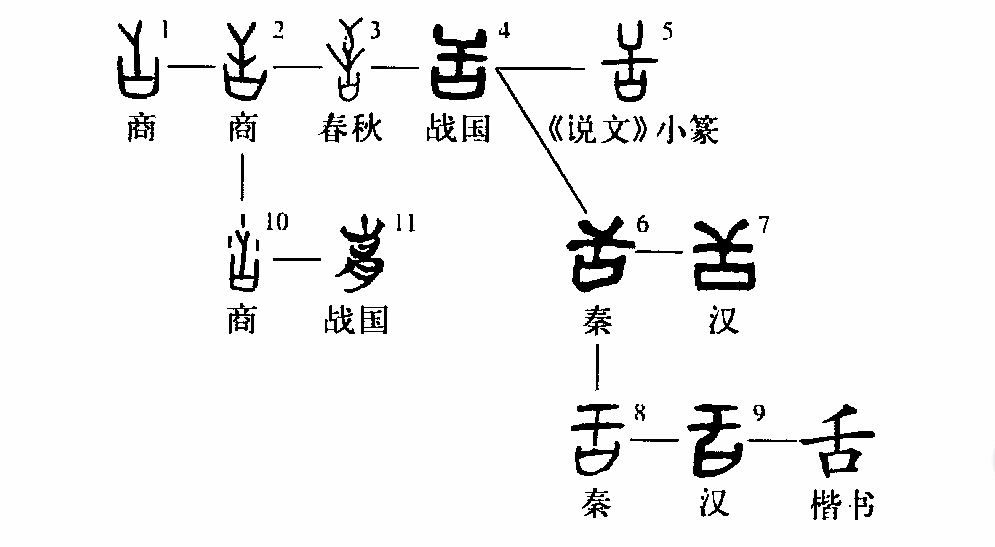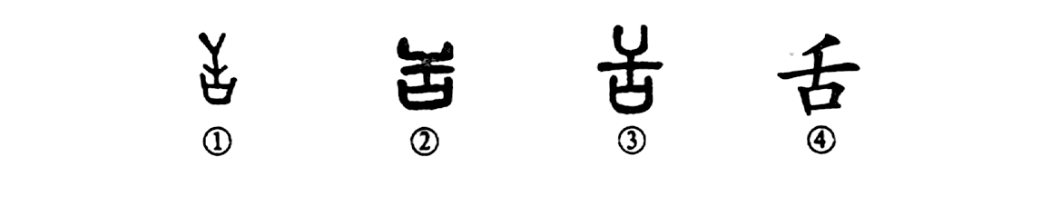 這是“舌劍唇槍”的“舌”字,是個(gè)象形字。①是甲骨文的形體,整體像舌形。②是古陶文的形體,與甲骨文相似。③是小篆的寫(xiě)法。④為楷書(shū)的寫(xiě)法。