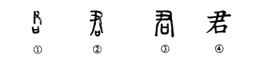 “君不見(jiàn)黃河之水天上來(lái),奔流到海不復回?!边@個(gè)“君”字本為會(huì )意字。甲骨文①的上部是一只手拿著(zhù)一枝筆,表示寫(xiě)字;其下部的“口”是文飾符號(也有人認為“口”發(fā)命令)。②是金文的形體,與甲骨文相似。③是小篆的寫(xiě)法。④為楷書(shū)的寫(xiě)法。