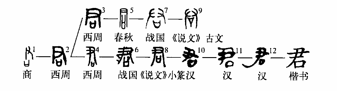 形聲兼會(huì )意字。從口、從尹,尹亦聲。尹像手執權杖形,口表發(fā)號施令?!熬庇伞耙弊址只?,但二字在甲骨文中用法并不完全等同,西周金文中二字分化比較徹底,混用只有個(gè)別用例(如公臣簋有三件,兩件作“天尹”,一件作“天君”)。《荀子·禮論》:“君者,治辨(辦)之主也。”古代帝王崇尚無(wú)為之治,具體的事都由手下人來(lái)辦理,這些主持辦理具體事務(wù)的人就是“君”,“君”本王臣之稱(chēng)。甲骨文中“君”字之義或與“尹”同用,如多君與多尹、多臣、多公均指人臣,西周仍承用此義。甲骨文、金文中商、周最高統治者稱(chēng)“王”或“余一人”,未有稱(chēng)“君”者。整個(gè)兩周時(shí)期,“天子”始終是周王的特有稱(chēng)呼。兩周金文中,周王以外之朝廷官員及諸侯國、方國之首領(lǐng)均可稱(chēng)之為“君”?!熬被颉疤炀痹诮鹞闹锌捎脕?lái)指周王之后妃,如作冊瞏尊“君令余作冊瞏安夷伯”之“君”;也可指宗婦,即宗子之妻,如五年琱生簋“以君氏令曰”之“君氏”?!熬边€用于職官名,如“里君”、“邦君”等。金文中“君”也用于指丈夫,反映出當時(shí)君統與宗統的合一,夫妻關(guān)系如同君臣關(guān)系。春秋戰國時(shí)用為封君之稱(chēng),如樊君鬲之“樊君”、邛君壺之“邛君”、鄂君啟舟節之“鄂君”,文獻中孟嘗君、信陵君、春申君等?!熬边€用為動(dòng)詞,表統治、治理義(見(jiàn)晉姜鼎),也可以用為姓氏。戰國中山王方壺始見(jiàn)“君臣”對稱(chēng),曰“遂定君臣之位”,同時(shí)君又稱(chēng)“主”,如“臣主易位”,這個(gè)意義是后世用為“天子”的“君”的一個(gè)重要演變鏈環(huán)?!熬焙笫辣阊苌瓿傻弁踔Q(chēng),指一國之國君,即最高統治者?!墩f(shuō)文》古文“君”字形體發(fā)生了訛變,侯馬盟書(shū)中就產(chǎn)生了這種寫(xiě)法,是由