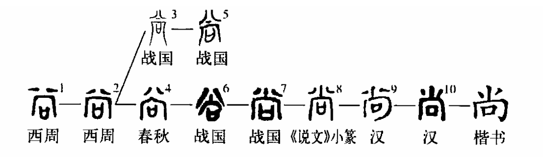 形聲字。《說(shuō)文》:“尚,曾也,庶幾也。從八,向聲。” “曾”、“庶幾”均后來(lái)義,初義不知。字形不見(jiàn)于殷商甲骨文,而見(jiàn)于先周周原甲骨。金文中多假“尚”為“?!?。陳侯因