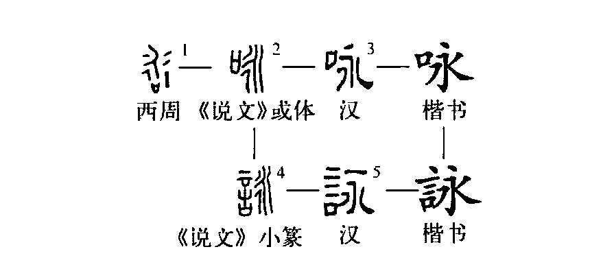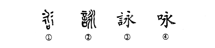 “復登于朝,遐邇詠歌。”這個(gè)“詠”字本為形聲字。①是金文的形體,從口,永聲。②是小篆的形體,因“口”與“言”義相近,故以“言”代“口”,其義未變。③為楷書(shū)形體,在廢除異體字時(shí)將該形體廢除了,現在只使用④的寫(xiě)法“詠”。