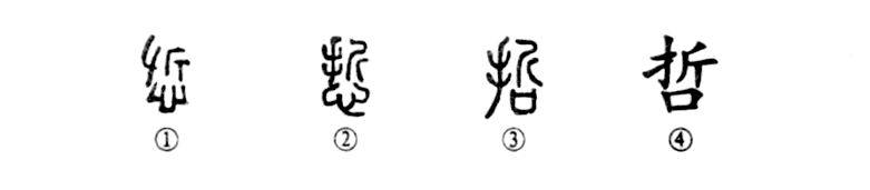 這是“知人則哲”的“哲字”,本為形聲字。①是金文的形體。其上部為“折”,表音,下部為“心”,表意,表示“聰明”之意。②是小篆的形體,直接由金文變來(lái)。③為小篆的異體字,將“心”換成“口”,其義未變。④為楷書(shū)的寫(xiě)法。