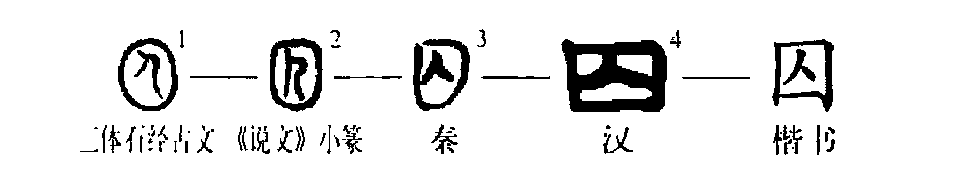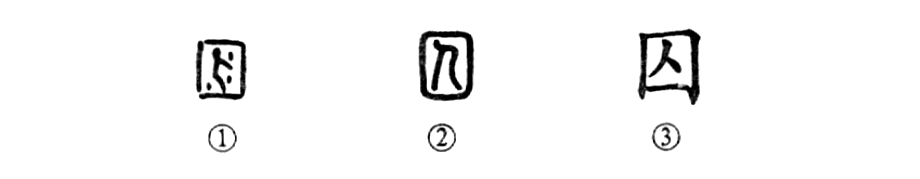 這個(gè)“囚”字很形象。從甲骨文①的形體看,周?chē)駛€(gè)土坑或井形,中間是面朝右立著(zhù)的一個(gè)人,人體周?chē)狞c(diǎn)兒是表示難受得身上冒汗。這是把罪人或者俘虜關(guān)起來(lái)的意思。所以這就是“囚犯”的“囚”字,是個(gè)會(huì )意字。②是小篆的形體,方框中像一個(gè)面朝左而下彎腰的人,身上的汗點(diǎn)兒都去掉了??瑫?shū)③是由小篆形體變來(lái)的,其組成部分與小篆同。
