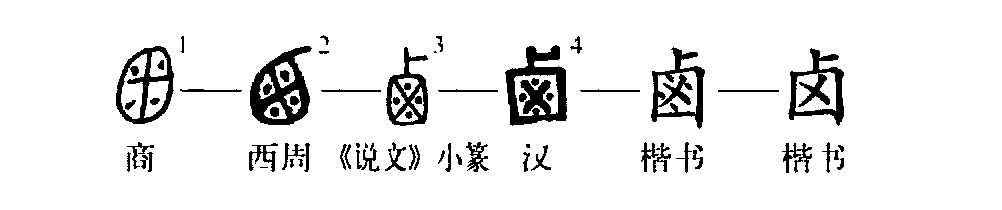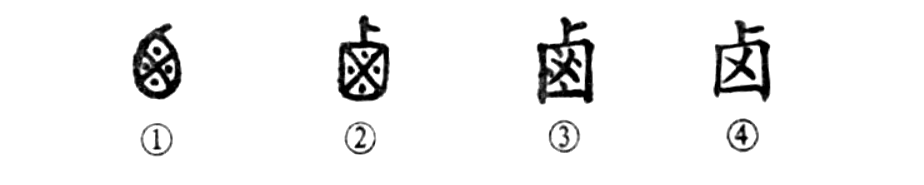 這個(gè)“鹵”字讀作lǔ,本為象形字。①是金文的形體,外部像裝鹽的容器,內部像裝滿(mǎn)了咸鹽。②是小篆的形體,與金文極為相似。③是楷書(shū)繁體字。④為簡(jiǎn)化字。
