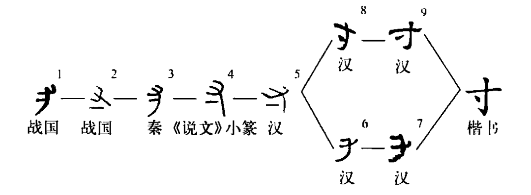 指事字。從又,從一。又為手之象,一是指事符號,處在手下一寸之地的寸口處,指出此地是寸口所在,上距后腕一寸。戰國文字已見(jiàn)寸字,結構與《說(shuō)文》相同。隸變時(shí),其結構、筆形、筆序、筆劃均經(jīng)過(guò)多次調整?;驅⒅甘路柹咸?,兩筆成
