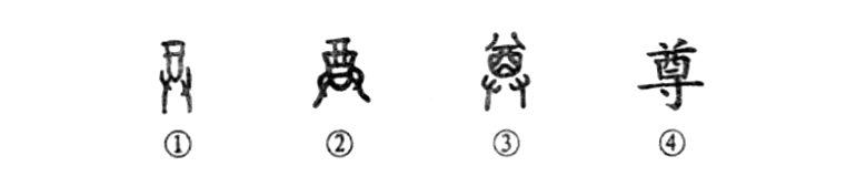 陸游《雜感》:“一尊易致蒲萄酒,萬(wàn)里難逢鸛鵲樓?!痹?shī)中的“尊”字就是一個(gè)會(huì )意字。甲骨文①的下部是一雙手,上部是一個(gè)大酒杯(或酒瓶),是赤誠獻酒的意思。金文②與甲骨文的形體比較一致,只是酒器上增添了幾道美麗的花紋。③是小篆的形體,在酒器(酉)之上又增加了兩撇,實(shí)為酒器的蓋子。④是楷書(shū)的寫(xiě)法,其下部由金文和小篆的雙手變?yōu)橐恢皇郑ù纾┝?,是由小篆直接演變而?lái)。