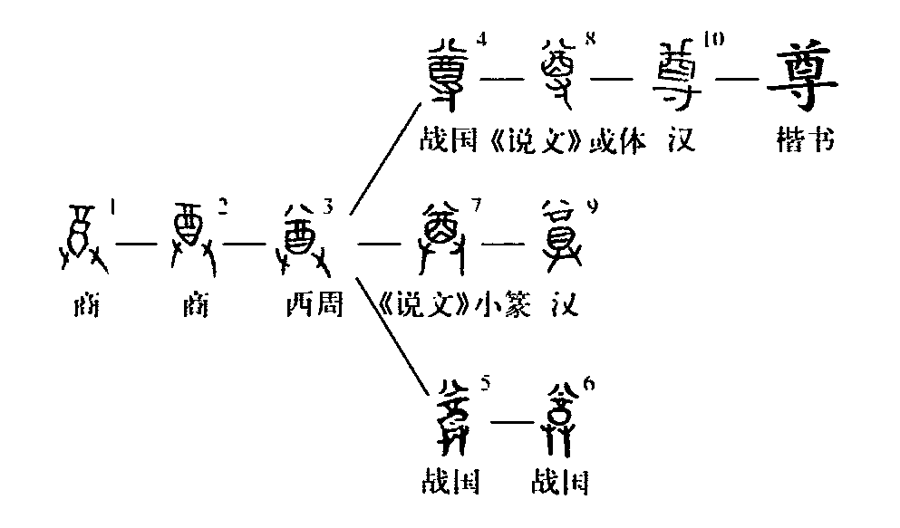 會(huì )意字。甲骨文字形從酉、從廾,后所從之“酉”繁化為“酋”,為《說(shuō)文》小篆所本;戰國時(shí)期秦文字中又省“廾”為“寸”,為《說(shuō)文》或體與楷書(shū)所宗;另有在“酋”字羨出一畫(huà)者。本義為一種用以盛酒的禮器?!墩f(shuō)文》:“??,酒器也。從酋,廾以奉之。”引申為盛酒祭奠。 《禮記·禮器》:“夫奧者,老婦之祭也,盛于盆,尊于瓶。”孔穎達疏:“盛食于盆,盛酒于瓶。”引申為尊奉、擁戴。《左傳·成公九年》:“無(wú)私,忠也。尊君,敏也。”引申為重視。《玉篇·寸部》:“尊,重也。”又引申為尊貴、高貴。《廣韻·魂韻》:“尊,貴也。”又虛化為敬詞,用以對帝王、長(cháng)輩及一般人的尊稱(chēng)。(李義海)