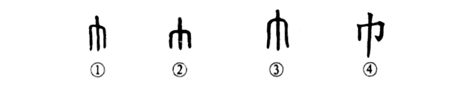 這個(gè)“巾”字是個(gè)象形字。甲骨文①就像掛下來(lái)的一幅布或一條手巾。金文②和小篆③也都基本上同于甲骨文。④是楷書(shū)的寫(xiě)法。