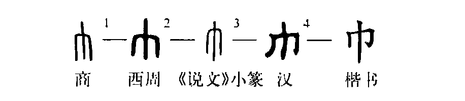 象形字。甲骨文像下垂的佩巾。金文承襲甲骨文。后來(lái), “巾”字中間的一豎漸漸拉長(cháng),右邊的“
