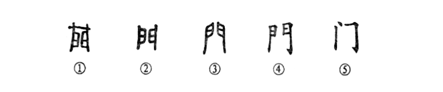 這是“執戟進(jìn)轅門(mén)”的“門(mén)”字,是個(gè)象形字。甲骨文①上部是一條嵌入門(mén)樞的橫木,下部很像兩扇門(mén)的形象。金文②則把門(mén)上的橫木去掉了,但仍保持兩扇門(mén)的原樣兒。③是小篆的形體。④是楷書(shū)的寫(xiě)法,基本上同于小篆。⑤是簡(jiǎn)化字。