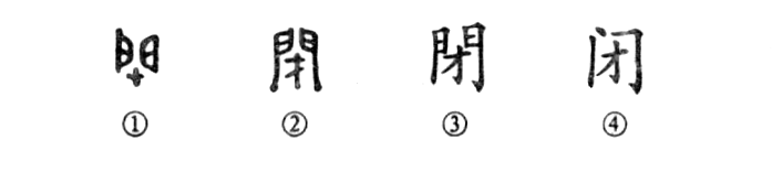 這是“城門(mén)閉,言路開(kāi)”的“閉”字,是個(gè)會(huì )意字。金文①的上部左右是兩扇門(mén),下部的“+”字就是門(mén)閂。門(mén)戶(hù)緊關(guān),插上門(mén)閂,這就是“閉”的意思。②是小篆的形體,兩扇門(mén)當中加上了兩條門(mén)閂,關(guān)閉得好緊,萬(wàn)無(wú)一失。到了楷書(shū)③,門(mén)閂偽變成“才”字了,其實(shí)“閉”字與“才”字毫無(wú)關(guān)系。④是簡(jiǎn)化字。