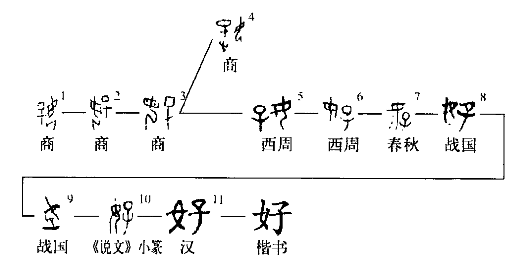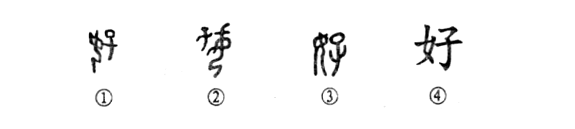 這個(gè)“好”字是個(gè)會(huì )意字。甲骨文①的左邊是個(gè)半跪著(zhù)的婦女,胸前抱著(zhù)一個(gè)嬰兒。金文②的左上部是一個(gè)嬰兒,右邊是半跪著(zhù)的婦女,最上部的一小橫,是婦女頭上的簪飾。到了小篆③“子”與“女”的位置又同于甲骨文了,可見(jiàn)在古代組成漢字各部分的位置往往是不固定的。④是楷書(shū)的寫(xiě)法。