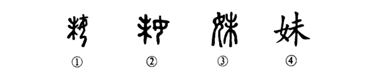 “姊妹弟兄皆列土,可憐光彩生門(mén)戶(hù)?!边@個(gè)“妹”字本為形聲字。甲骨文①的左邊是“未”,表聲;右邊是“母”,表形。②是金文的形體,其左邊未變,右邊由“母”變?yōu)椤芭?,義近。③是小篆的寫(xiě)法,左右位置對調。④為楷書(shū)的形體。