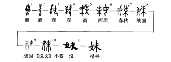 形聲字。從女,未聲。甲骨文“妹”字所從“女”,或在“未”左、或在“未”右、或在“未”下;從女或作從“母”,因甲骨文“女”與“母”初為一字,后來(lái)分化。金文、戰國文字并從女未聲,與《說(shuō)文》篆文同。本義是同父母而年齡比自己小的女子。《說(shuō)文》:“妹,女弟也。”宋公??:“其妹句敔夫人季子。”《詩(shī)·衛風(fēng)·碩人》:“東宮之妹,邢侯之姨。”甲骨文“婦妹”,人名。《合集》6552:“乙未婦妹示屯。”或假為“昧”,指天將明未明之時(shí)。《合集》38137:“妹(昧)雨。”(黎明時(shí)下雨)大盂鼎:“女(汝)妹(昧)辰(晨)又(有)大服。”“妹辰”,典籍作“昧爽”。《書(shū)·牧誓》:“時(shí)甲子昧爽。”(徐在國)