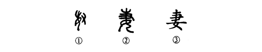 “爺娘妻子走相送,塵埃不見(jiàn)咸陽(yáng)橋?!边@個(gè)“妻”字是會(huì )意字。①是甲骨文“妻”字的形體,其下部為面朝左跪著(zhù)的一個(gè)婦女,頭上是蓄長(cháng)發(fā)之形,右上部有一只手,整個(gè)形體是“捉女為妻”,這與上古的搶親風(fēng)俗有關(guān)。②是小篆的形體,與甲骨文基本相似。③是楷書(shū)的寫(xiě)法。