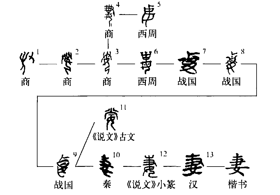會(huì )意字。甲骨文“妻”字從又(或從??)持女發(fā),會(huì )奪女(搶親)為妻之意。西周金文或作