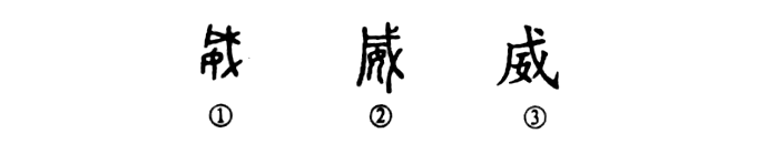 這是“威振天下”的“威”字。是個(gè)會(huì )意兼形聲的字。①是金文的形體,右邊是一把類(lèi)似長(cháng)柄大斧的武器,左下角是一個(gè)女人,即表示“施威”之意?!拔臁币脖砺?。②是小篆的形體。③為楷書(shū)的寫(xiě)法。